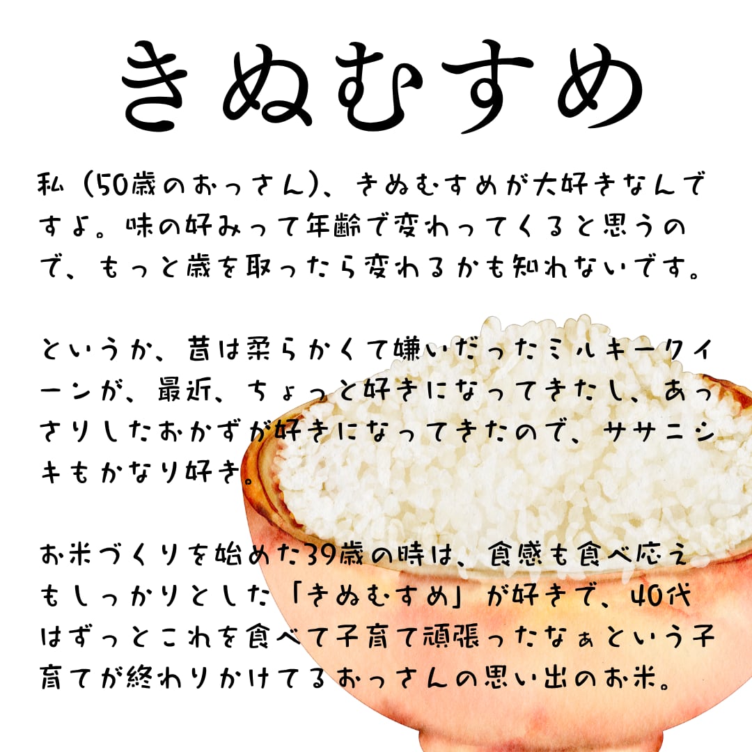 どんぐり農園の代表銘柄としてきぬむすめを作っています。どんぐり農園は「おかずと合わせて美味しいお米」、みんなが笑顔で食卓を囲めるお米であって欲しいなと思っています。